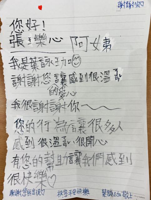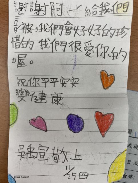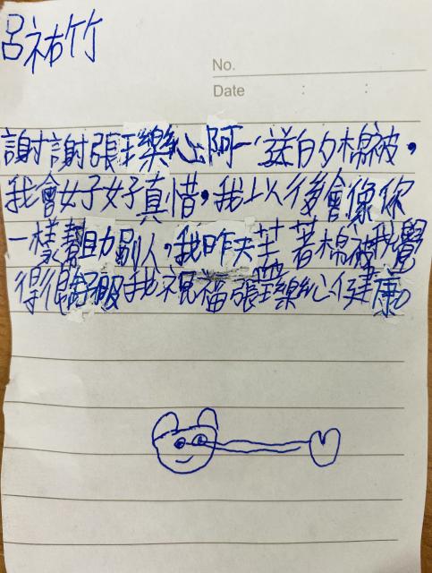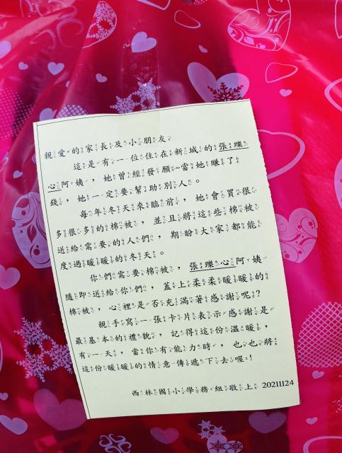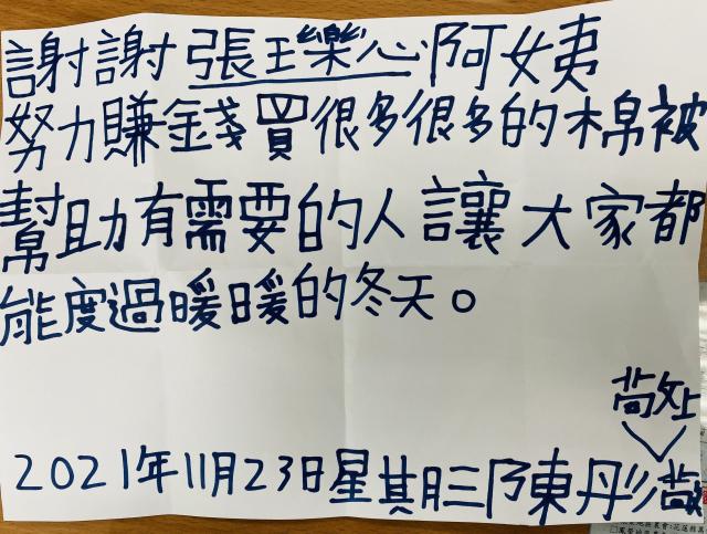 這是有一位住在新城的張瓅心阿姨,她曾經發願~當她賺了錢,她一定要幫助別人。 每年冬天來臨前,她會買很多很多的棉被,並且將這些棉被送給需要的人們,期盼大家都能度過暖暖的冬天。孩子們需要棉被,張瓅心阿姨隨即送來了! 蓋上柔柔暖暖的棉被,心裡是否充滿著感謝呢? 親手寫一張卡片表示感謝是最基本的禮貌,請記得這份溫暖。 有一天,當你有能力時,也要將這份暖暖的情意傳遞下去喔!