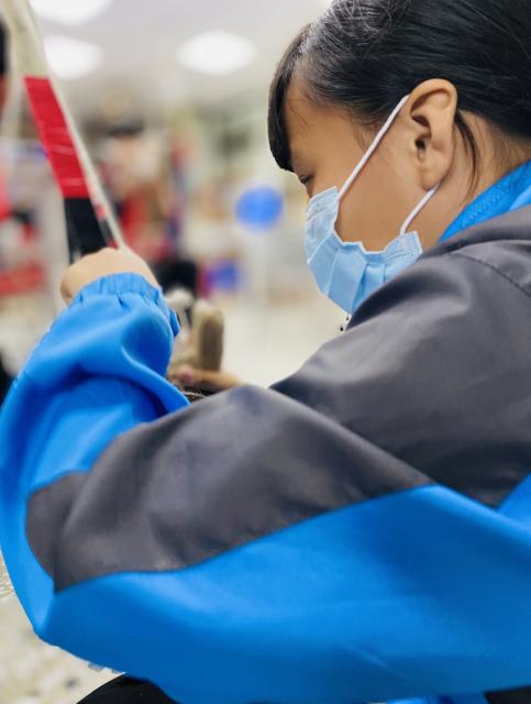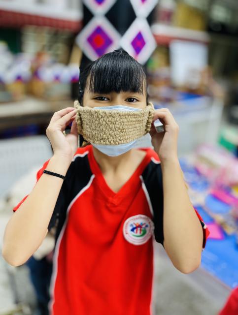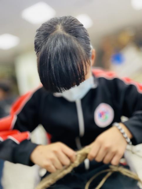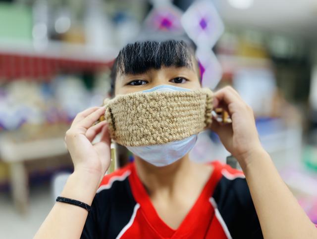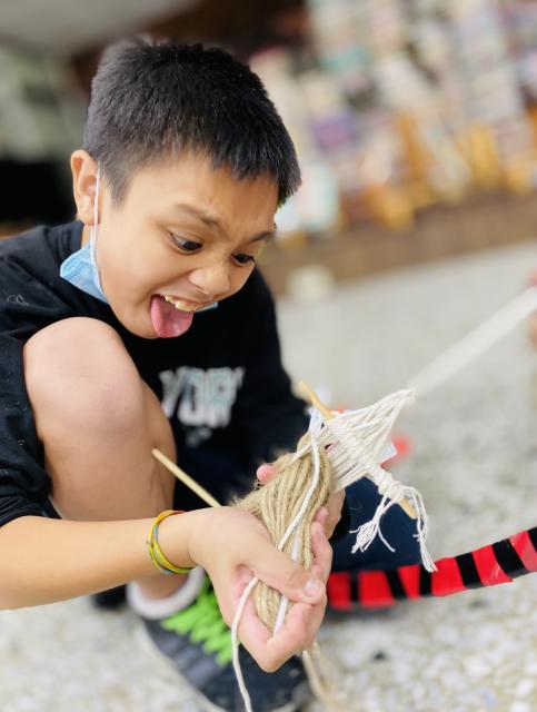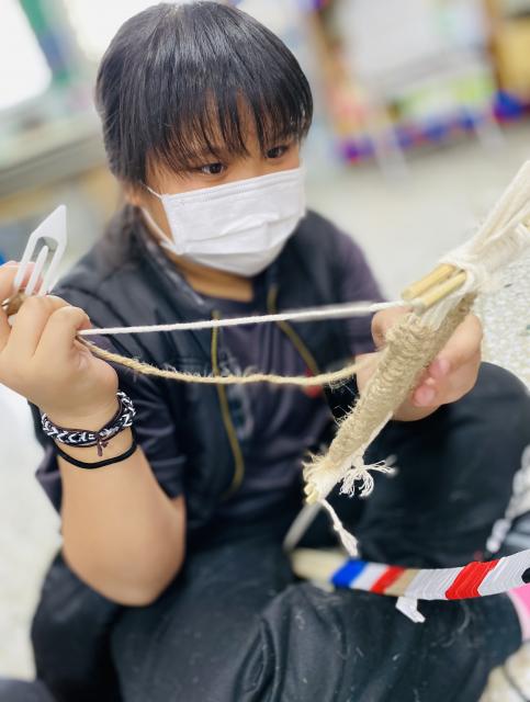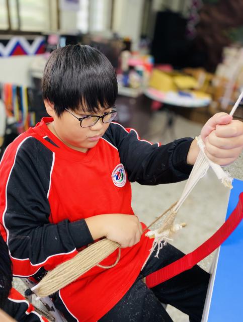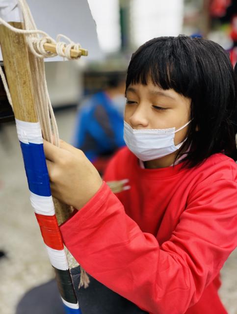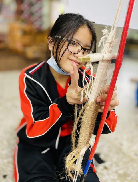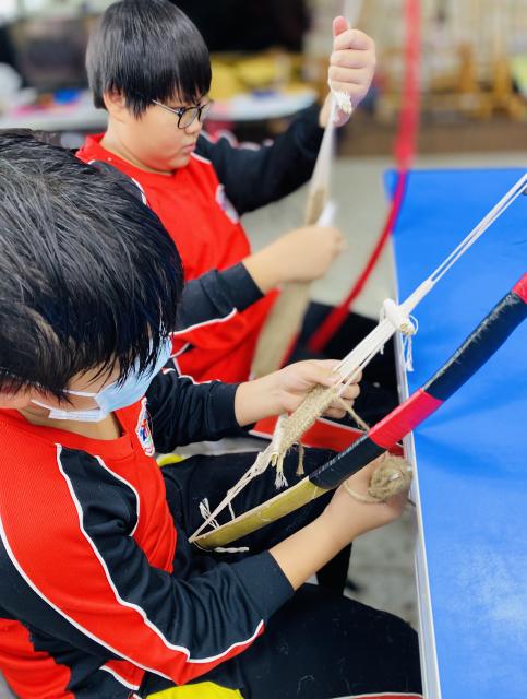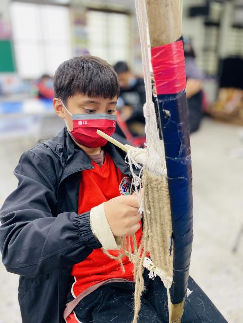 女孩織布;男孩弓織。 弓織需要很大的力氣,勒巴克和雅繃老師也教得很用力。 短短一條背帶,五甲孩子用了一個月的時間鑽呀!拉的~不容易耶! 短短的,兩旁又有兩個圈,看起來像什麼? 對啦!就是疫情時代的生活必需品~口罩,這樣的口罩應該很猛吧!