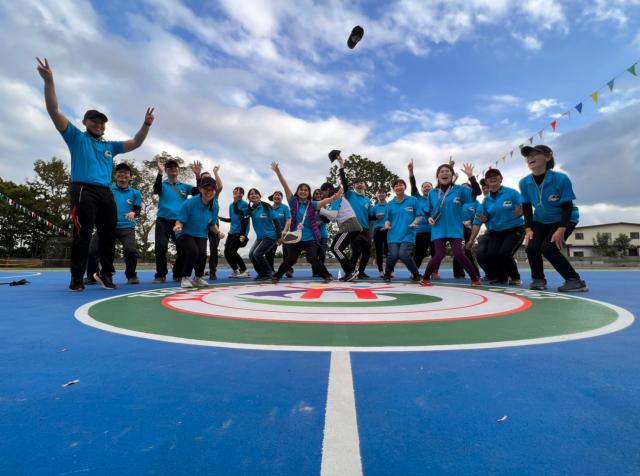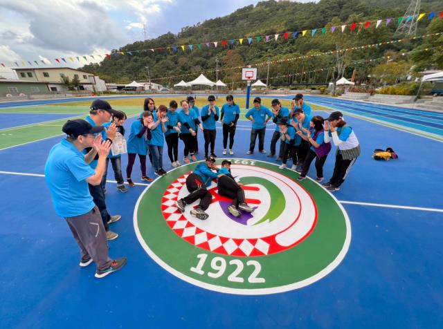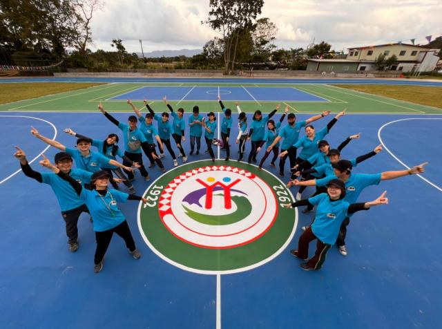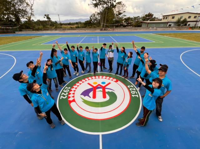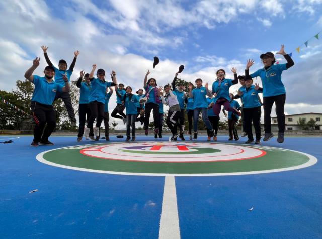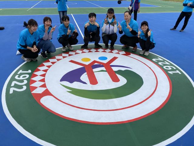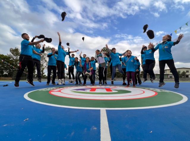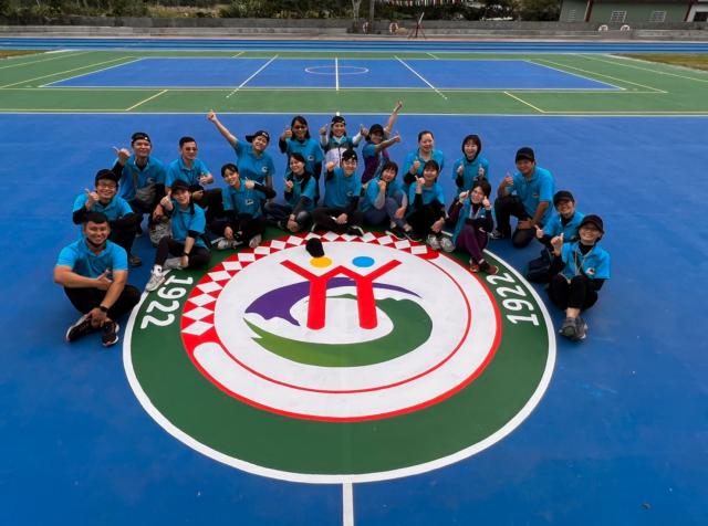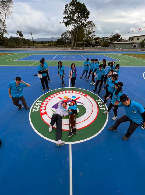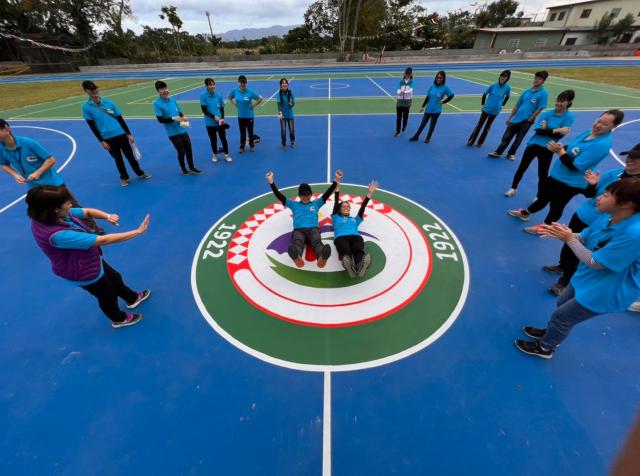 西林校園新的打卡點~籃球場上的校徽。 躺著、圍著一圈,一手指地,一手指天,我們優游在天地間。