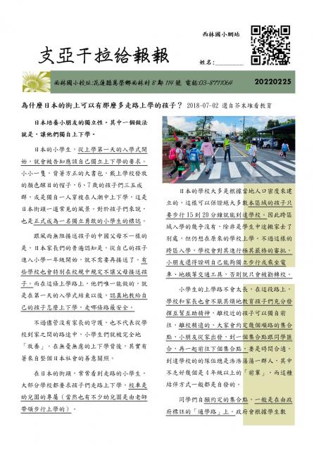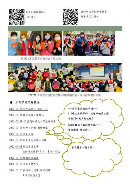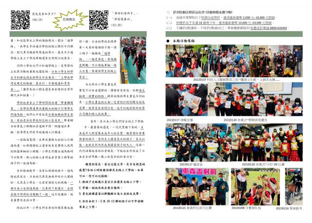 1.借鏡日本經驗~鼓勵孩子走路上下學 2.反毒教育宣導 3.姜通安全教育宣導 4.網路安全宣導