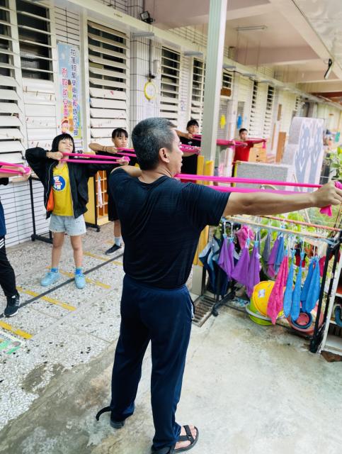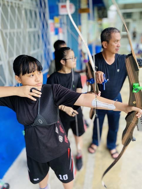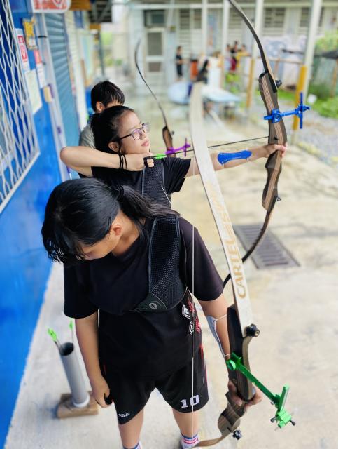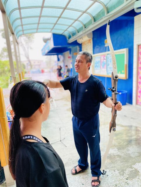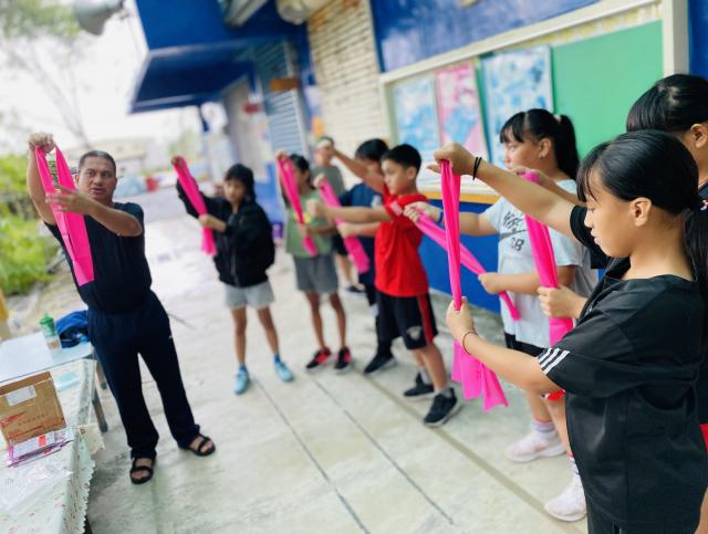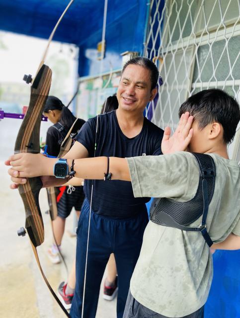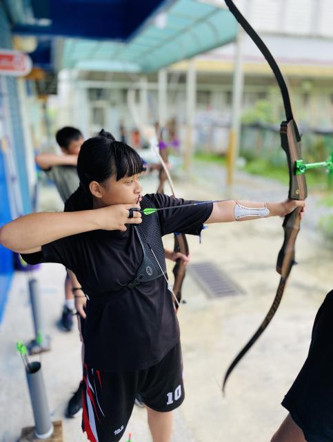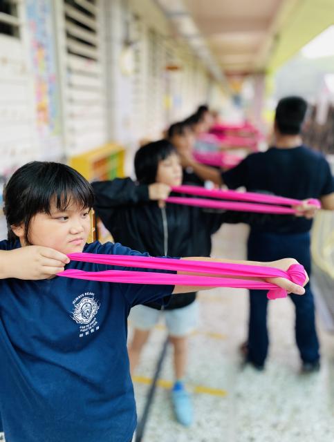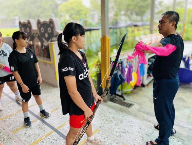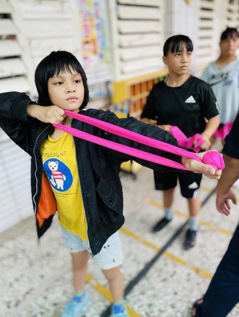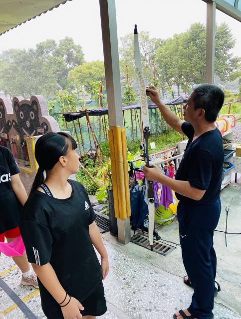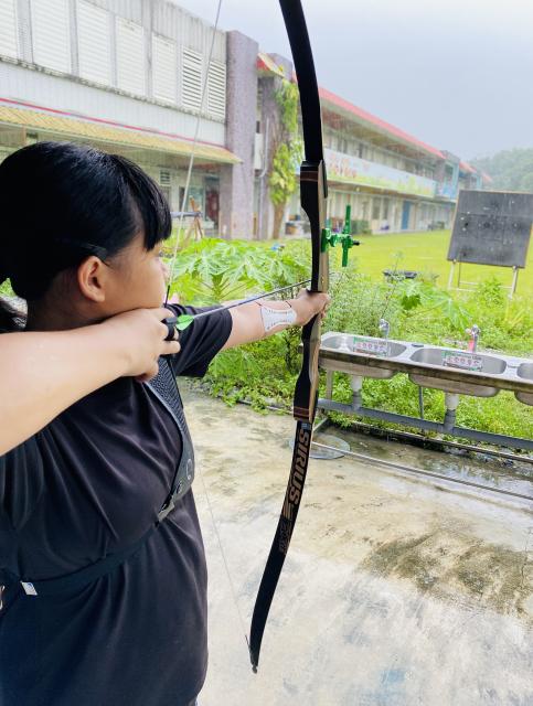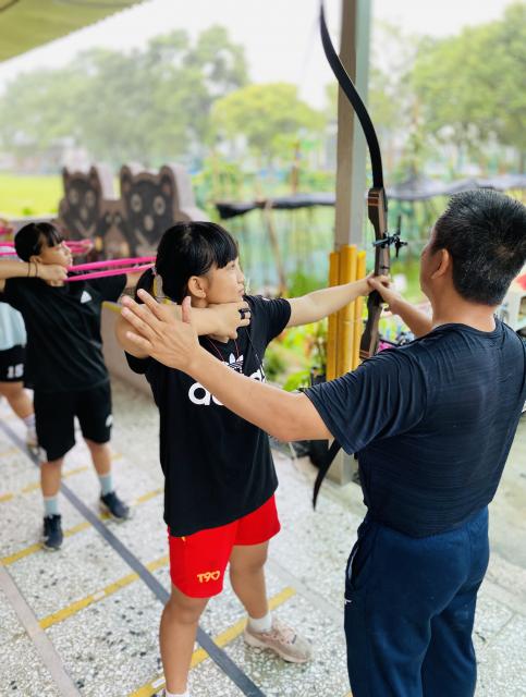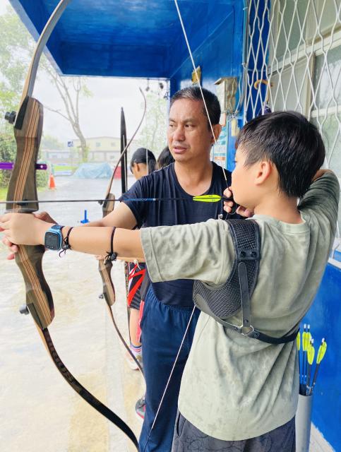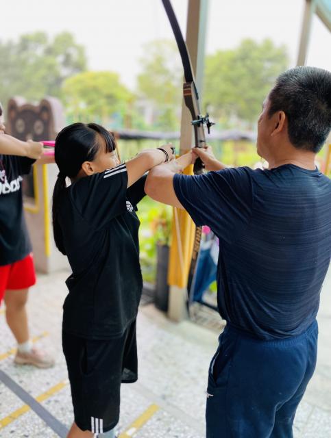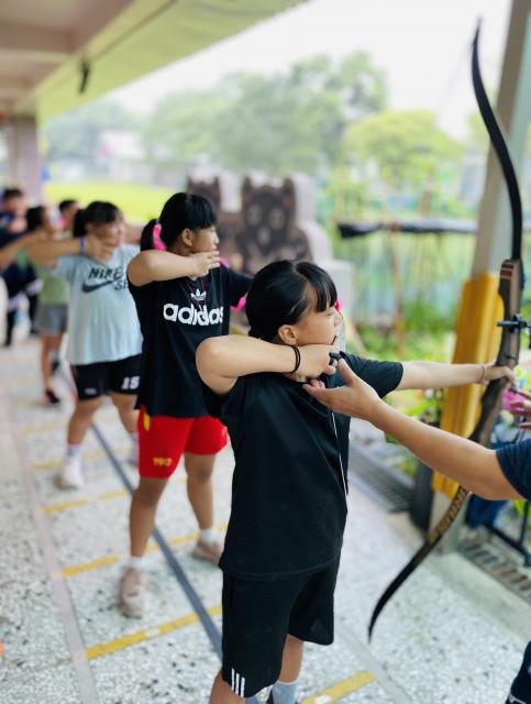 雖然下雨了,走廊很可以! 有學過的學長姐,直接穿著裝備,拉起弓,瞄準,放箭! 沒學過的新學員,一起跟著教練拉起彈力帶練習~ 大家都準時到校練習~很棒的孩子!