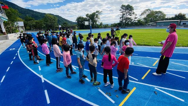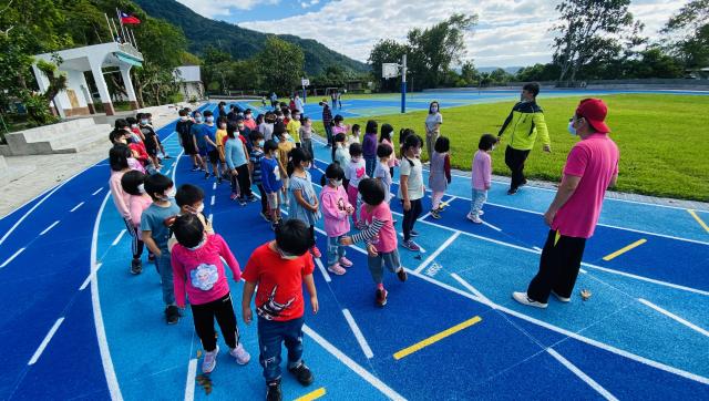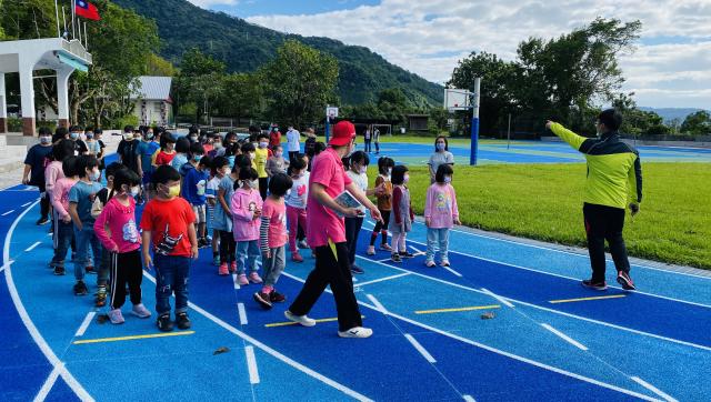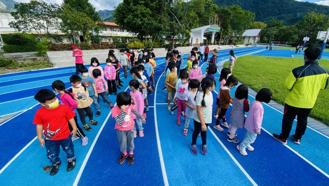 往後每週三我們可能會玩接力賽喔! 走一遍自己的跑道,黃色區域是接力區,超過即淘汰喔! 俊彥老師說得很清楚,你們可聽清楚了嗎?