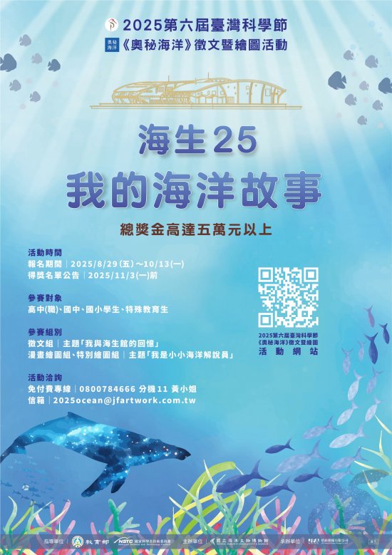檢送國立海洋生物博物館「2025第六屆臺灣科學節《奧秘海洋》徵文暨繪圖活動」,請查照。